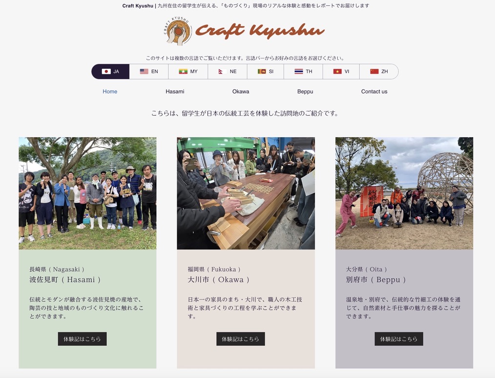 2025年10月、多言語で記事を読めるWEBサイト「craft kyushu」を公開しました。九州各地にはさまざまな製造業があり、どれもすばらしい歴史と伝統技術を備えています。留学生たちはものづくりの現場を訪れ、見て、体験し、それぞれの産業に携わる方々のお話を聞いてきました。そして、各自の目を通して、日本のものづくりの楽しさや素晴らしさを発信しています。